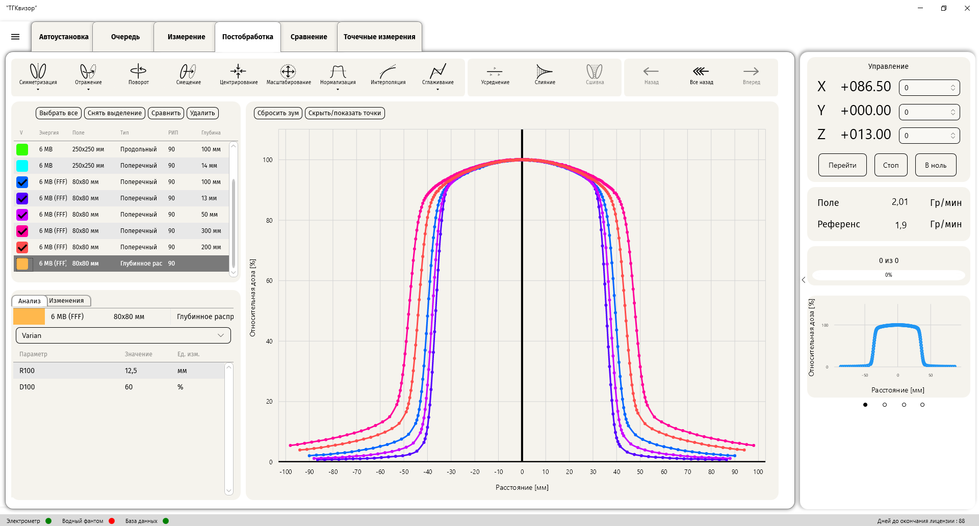 ПО взаимодействует с дозиметром для получения данных об ионизирующем излучении и предоставляет удобный функционал для проведения измерений и дальнешего анализа данных.